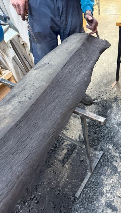 Notre stock de bois brûlé intéresse tout particulièrement l’artiste : nous réalisons l’ensemble des objets avec ce matériau dont nous disposons à profusion. Usinés juste ce qu’il faut pour révéler son veinage tout en conservant des traces de la flamme, le chêne incendié confère une étrange aura aux objets, qui racontent autant la précarité que la pérennité.